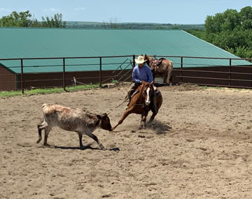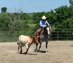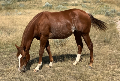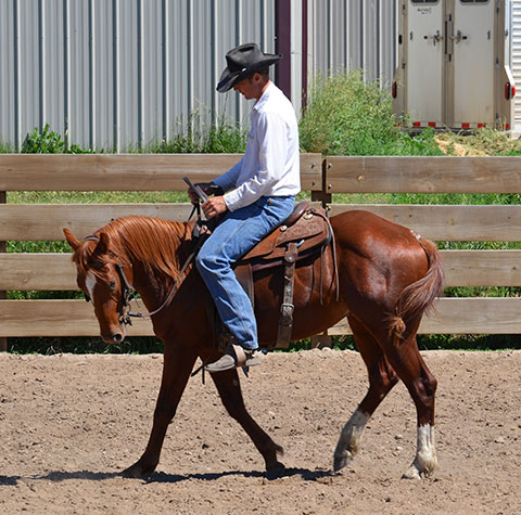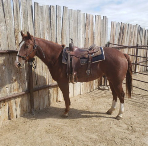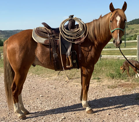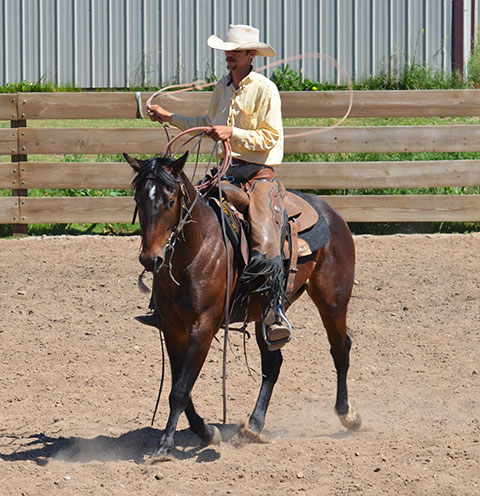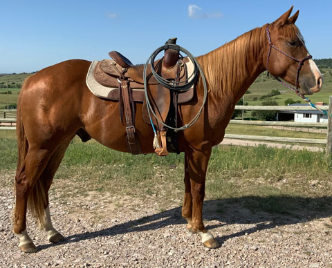 He was started by Justin Lawrence as a 2-year-old. He is continuing his training at the ranch to be a ranch/rope horse. He will watch a cow and is making good progress.